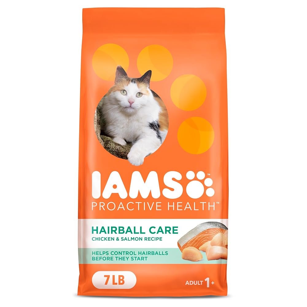 - 7 lb. Bag: Contains one (1) 7 lb. bag of IAMS PROACTIVE HEALT Adult Hairball Care Dry Cat Food with Chicken and Salmon